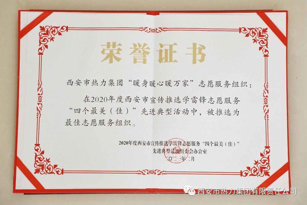 3月5日,西安市委宣传部、西安市委文明办等14部门公布了2020年西安市学雷锋志愿服务“四个最美(佳)”先进典型名单,西安市热力集团“暖身暖心暖万家”志愿服务组织荣获西安市“四个最佳”志愿服务组织。